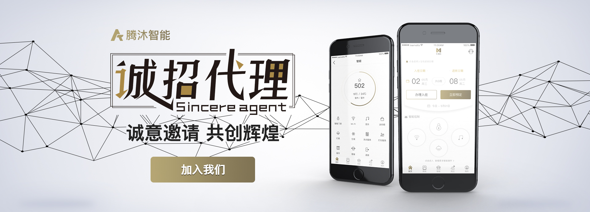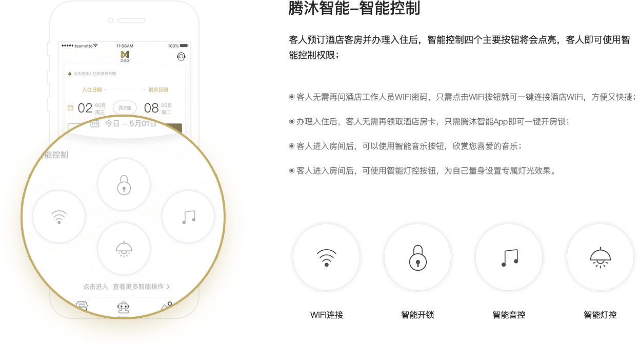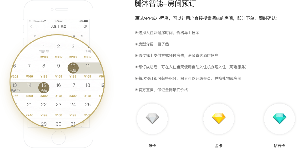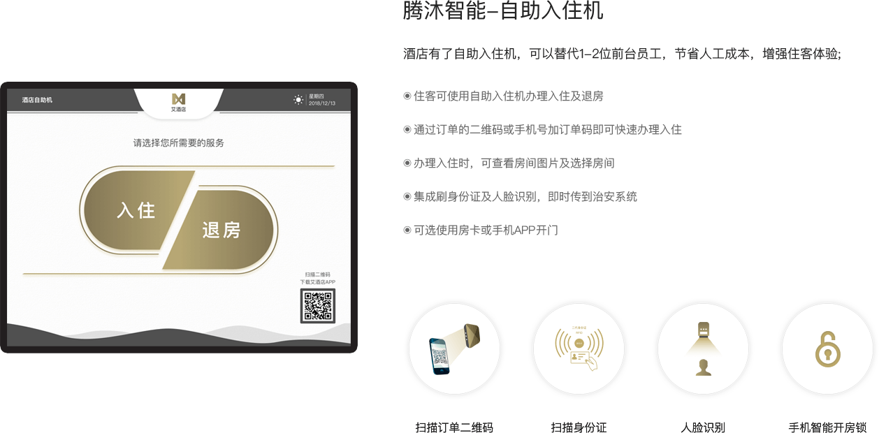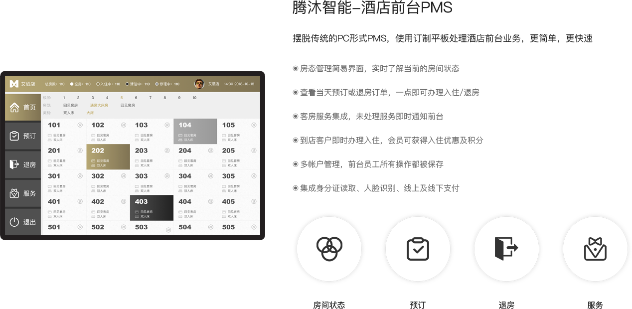 腾沐提供面各客户的APP、小程序和自助入住机;同时为酒店提供PMS、前台PMS平板、客房服务APP。